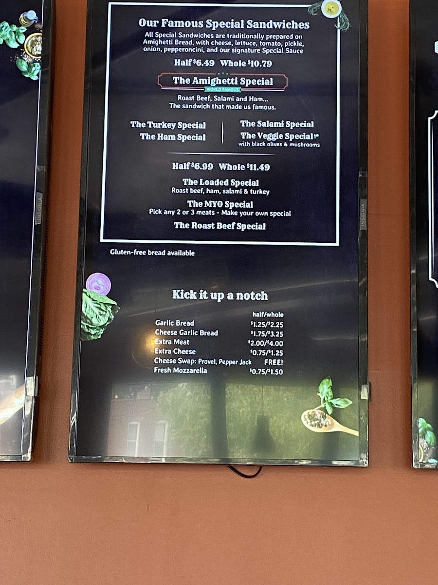 The Special Sandwiches, including the MYO Special and Loaded Special, allow you to customize your experience, inviting diners to explore combinations of delicious meats layered on Amighetti's distinctive bread.